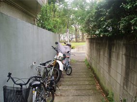 天沼弁天公園(写真正面)から真っすぐに延びた細い石畳暗渠。これが弁天池を水源とした桃園川の最初の流れの跡である